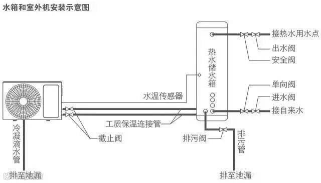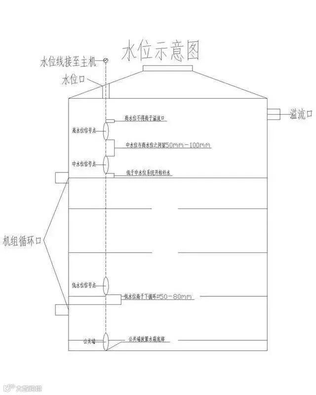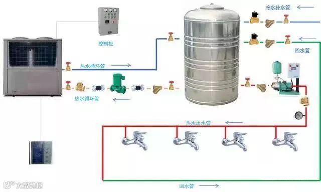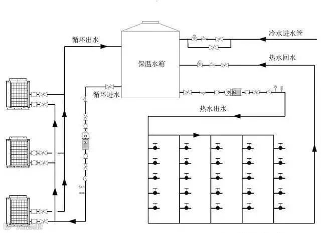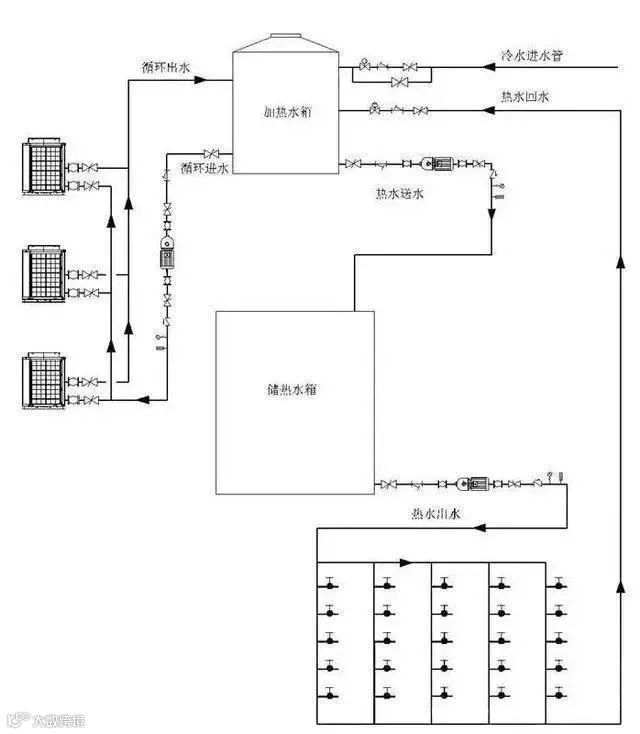 循环大小水箱工程系统图循环机组使用加热水箱和储热水箱分离设计,机组集中热量加热小水箱(加热水箱),时期温度到达设定温度后将热水放至大水箱(储热水箱),如此循环动作。