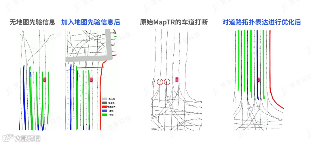 2023年8月,觉非科技就已启动对MapTR方法的创新与优化,包括采用车道中心线表征车道级间的拓扑关系,增加车道方向学习,增加车道边界线属性信息等。