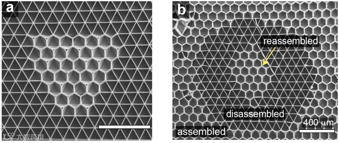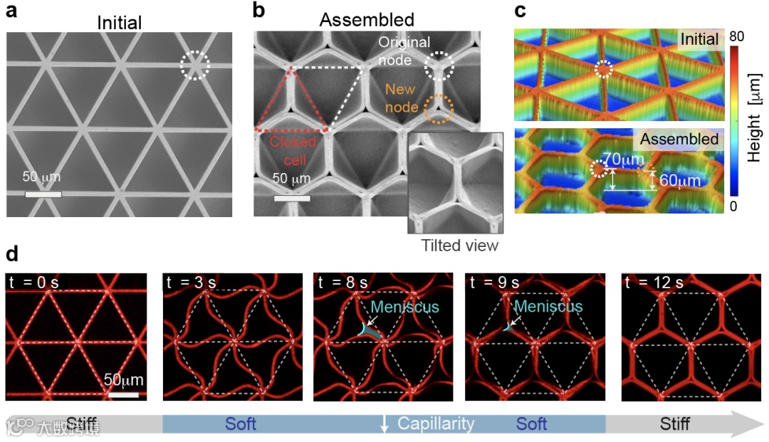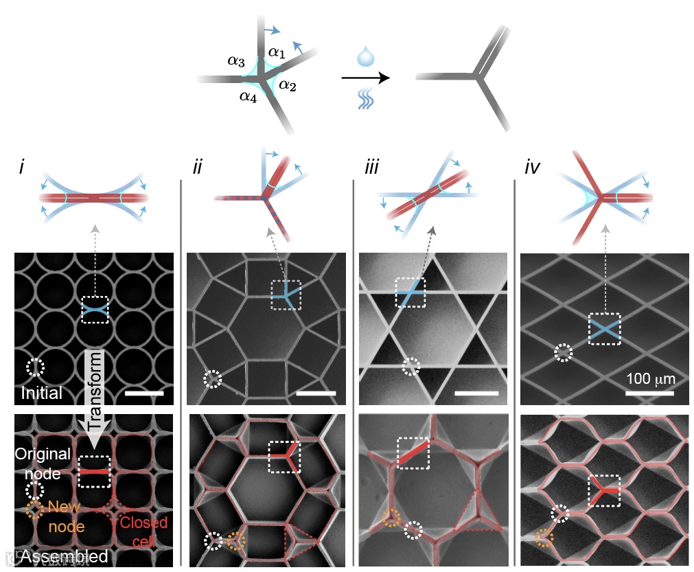 图2. 三角形网格的微结构被一滴溶液被组装成六边形网格,实现了结构的拓扑变化