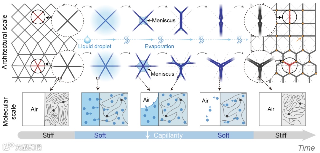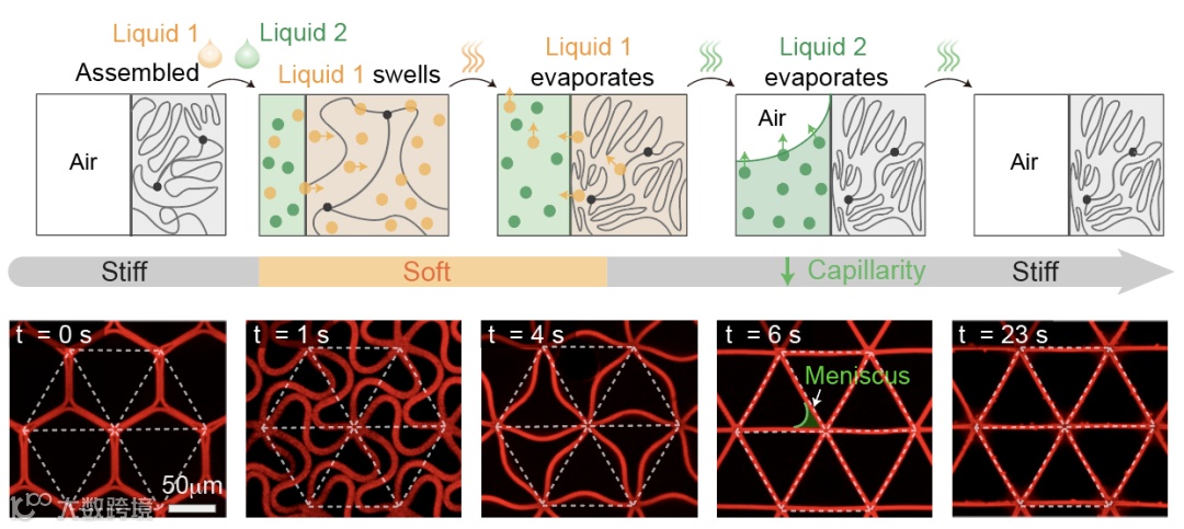 为了解决这个问题,该团队提出了一种二重尺度共同作用的软化-组装-硬化的策略:加入的液体一方面在结构尺度(微米)形成大量气液界面,对结构施加局部毛细力;另一方面在分子尺度上通过溶胀其组成材料,实现高分子材料的暂时性软化(图1)。因为环境中的液体先于高分子材料里的液体蒸发,所以毛细力总是作用在被软化的结构上,这大大降低了变形过程中的阻力,让弱小的毛细力也能组装蜂窝结构并最终改变它的拓扑特性。在所有液体从环境和高分子材料内部蒸发掉后,材料又会硬化回最初的杨氏模量来保证稳定良好的力学性能。