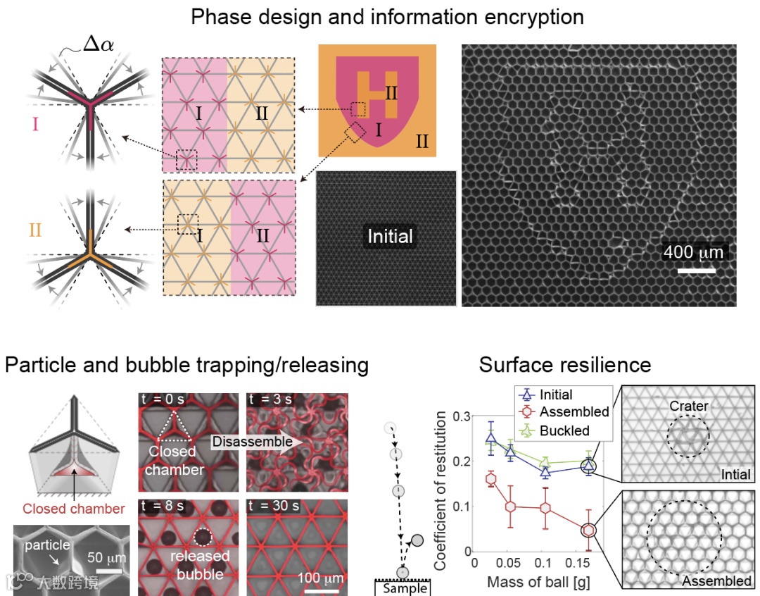 除了对材料和几何结构较好的普适性,该策略具有制造简单、结构变换快速、稳定、高度可重复等特点,具有很强的实用性和工业应用的潜力。该团队展示了一系列拓扑结构变换带来的潜在应用,包括信息的加密存储和读取,对颗粒、气泡的捕获和释放,以及对材料表面弹性、摩擦度、润湿性的调控等(图6)。