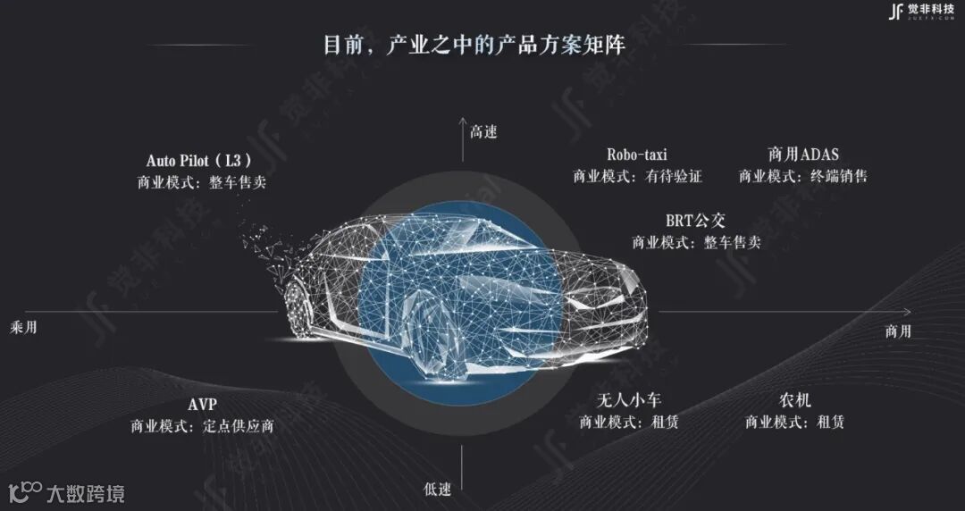 那么,这三条路径分别演进出来的产品形态是什么样子的?这里我们从市场落地的角度来分析,把现有的智能驾驶产品进行坐标系表达。以乘用车和商用车作为横轴,纵轴用高速和低速来区分。