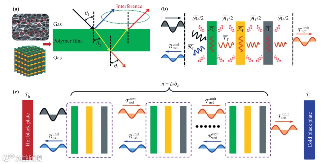 图4 热辐射通过具有多层的材料传播行为的示意图:(a)单一膜模型。(b)一组由一层反射吸收薄膜和两个纯吸收薄膜组成的模型。(c) n组三层薄膜单元夹在一个热黑体板和一个冷黑体板之间的情况