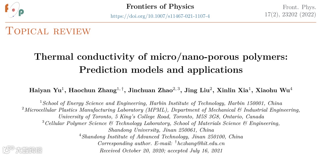 哈尔滨工业大学博士研究生于海燕和其导师张昊春教授与山东高等技术研究院的吴小虎副教授合作,回顾并总结了近年来微纳米多孔聚合物材料的等效热导率计算模型的建立过程和适用条件,在中科院二区期刊Frontiers of Physics上发表了评论文章。本研究可为纳米多孔聚合物材料在建筑物隔热层,辐射制冷装置,能量调节织物等节能装置中的应用提供了普适的理论依据和设计指导。