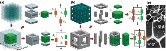 图3 多孔材料的简化模型的热传导等效热导率推导过程的示意图[:(a)闭孔模型;(b)开孔模型;(c)孔壁结构示意图