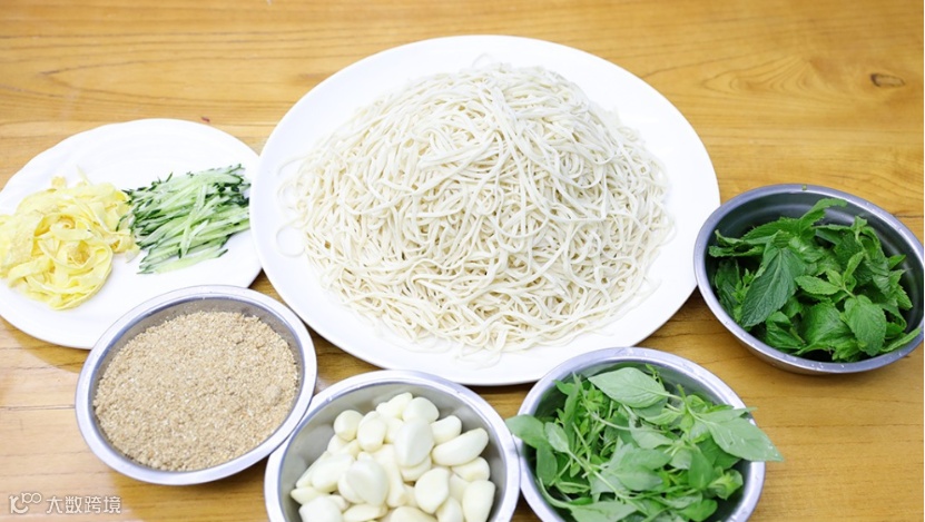 1.准备适量的鸡蛋丝、黄瓜丝备用。十香叶、荆菜叶,清洗干净备用和半碗芝麻盐备用。
