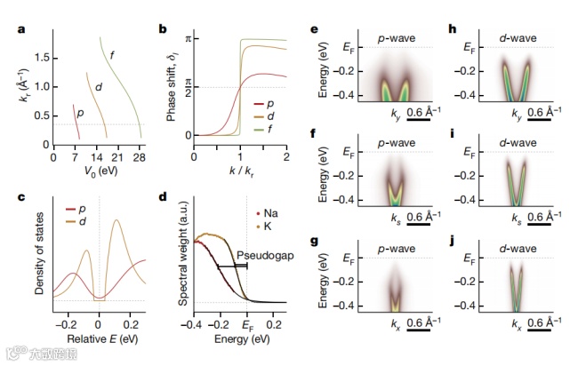 4、由于d波赝能隙的陡峭倾斜,使得ARPES谱在色散的后弯部分表现出明显的类隙特征,且谱重很小。因此,该光谱模拟不仅再现了实验观测的关键方面,而且自然地通过赝隙、p波或d波的轨道性质解释了Na和K、Rb和Cs掺杂的区别。