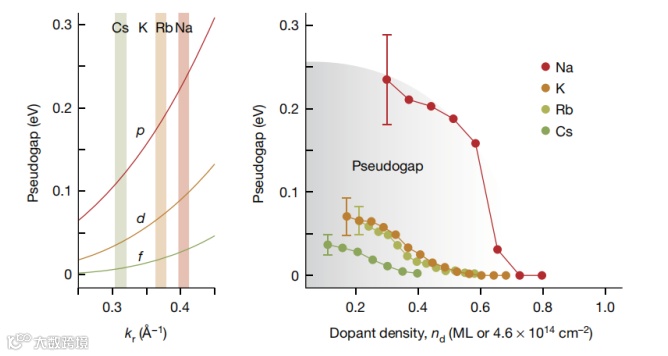 1、从不同种类的碱金属的赝隙大小可以看出,在灰色所示的宽范围内,在EF处持续观察到赝能隙,kr与掺杂剂的平均原子间距离成反比,其平方对应于nd,即nd∝kr2。