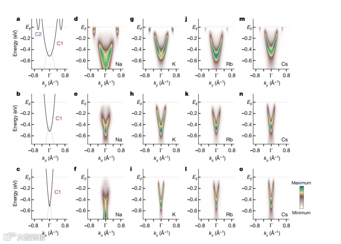 2、从表面掺杂不同种类碱金属(Na、K、Rb和Cs )的块状黑磷中取出的一系列ARPES数据,在每个面板右下方标注。在沿ky取Na的数据发现,C2带在±0.6Å−1处有明显的特征。相比之下,在图2a中观察到C1波段明显偏离预期。与C2带尖锐的费米-狄拉克截止频率可作为EF的内参不同,C1带表现出与EF至少0.2 eV的带隙特征。
