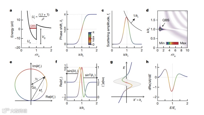 2、作者由该有效势散布的电子波获得相移δl为k的函数,如果δl在第l个部分波中通过π/2上升,则散射振幅fl的大小在共振k处出现峰值,即kr共振的特征。它们的破坏性干扰在空间上将电子波局域在每个离子周围的势阱中,形成准束缚态(QBS)。