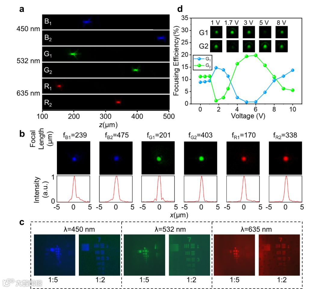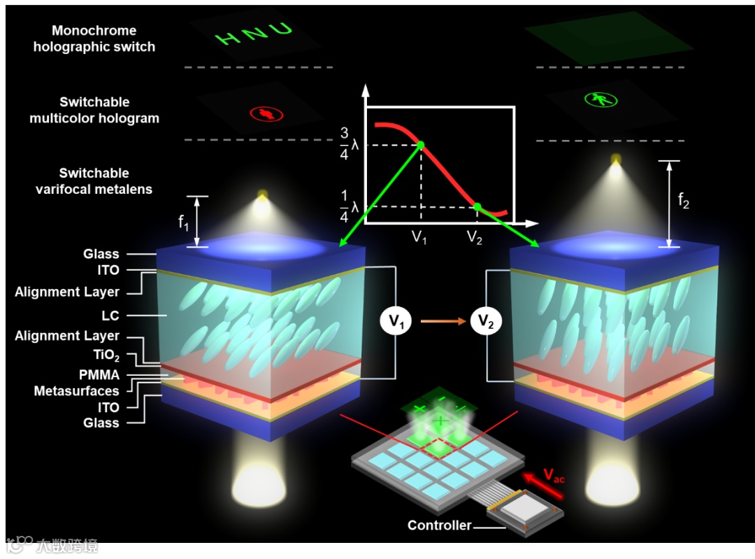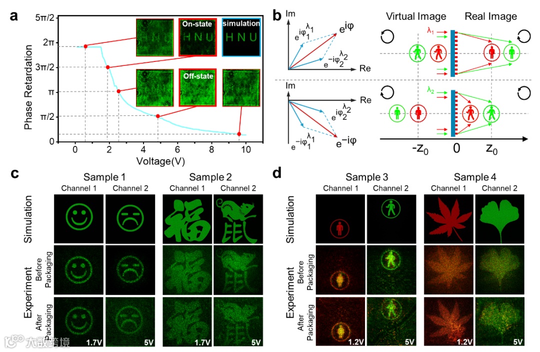 图二 电控可调单色和多色可切换超构表面全息演示