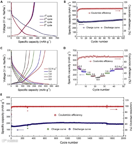 研究机理表明,通过改变剪切力可以很好地调节系统中的胶束结构。更重要的是,可以通过建立按需搅拌模型以编程方式进行合成过程,从而实现多级介观结构的智能组装。介孔碳纳米球粒径小,比表面积大,氮源丰富,且具有放射状的开孔结构,因此,钠离子储存能力强,循环寿命超长。这种简便的可编程组装方法将为探索新型的复杂多级介观结构提供新的机会。