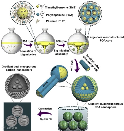 以三嵌段共聚物F127作为软模板,1、3、5-三甲苯(TMB)小分子作为介体,乙醇/水混合物为溶剂,多巴胺(DA)分子作为氮源和碳源,通过可编程的剪切诱导动态组装方法,以及在N2中煅烧,合成了具有独特梯度孔的介孔碳纳米球。