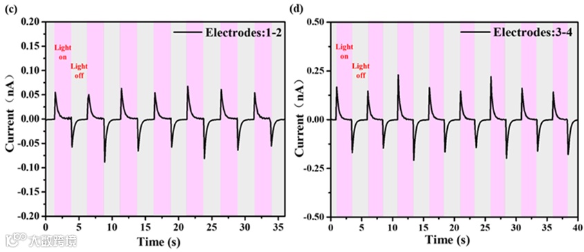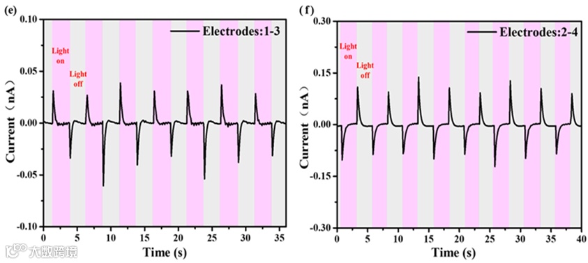 在研究过程中,当激光辐照在x-cut铌酸锂上,铌酸锂吸收热量产生温度梯度的变化,使得铌酸锂自发的铁电极化发生改变,器件会瞬间产生尖峰电流,随后随着时间呈现指数衰减的变化。当关闭激光时,铌酸锂温度又发生改变,此时器件会瞬间产生反向的尖峰电流,随后也随着时间呈现指数衰减的变化。通过周期性开/关激光,分别测试电极1-2和电极3-4两侧的热释电流,在有光照的情况下产生正向电流,在无光照的情况下产生负向电流,如图2(c)-(d)。由于连接电极1-2和电极3-4两侧所产生的热电流相同,表明在电极1-2和电极3-4两侧累积的电荷类型是相同的。同样地,通过周期性开/关激光,分别测试电极1-3和电极2-4两端的热释电流。连接电极1-3,器件在有光照的情况下产生正向电流,在无光照的情况下产生负向电流,如图2(e)。但是连接电极2-4时,器件在有光照的情况下产生负向电流,在无光照的情况下产生正向电流,如图2(f)。由此可见,在电极1-3和电极2-4两侧累积的电荷类型是相反的。此时,如果在图2(a)的铌酸锂基底上转移石墨烯,不同区域的电荷对石墨烯掺杂情况不同,电极1-3处会进行P型掺杂,电极2-4处会进行N型掺杂。