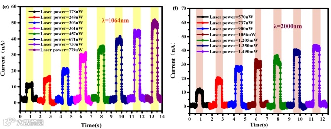 研究团队分别使用厚度为500 μm的铌酸锂体材料和厚度为700 nm铌酸锂薄膜(@济南晶正电子NanoLN)作为器件基底,制备出基于铌酸锂基底的石墨烯光电探测器如图1所示。其中,基于铌酸锂块材基底的石墨烯光电探测器可用于405 nm-2000 nm宽光谱探测,在24 pW光功率(λ = 1064 nm)下的响应度为~2.92×106 A/W、具有~8.65×1014 Jones的比探测率,响应上升/下降时间分别为~23 ms/~23 ms。基于铌酸锂薄膜(@济南晶正电子NanoLN)基底的石墨烯光电探测器在405 nm-2000 nm范围内也具有宽光谱探测,在25 pW入射功率(λ = 1064 nm)下的响应度为~1.78×105 A/W、具有~3.32×1011 Jones的比探测率。在808 nm入射激光下响应上升/下降时间分别为~3.3 ms/~2.1 ms。与已经报道的光电探测器相比,该器件表现出优异的光电性能。