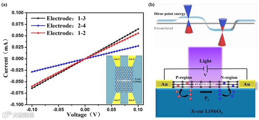 为了解决以上问题,研究人员开始使用二维材料来提高微纳光电探测器的性能,其中石墨烯具有宽带宽吸收、可调能带和高载流子迁移率等优异光电性能,使得基于石墨烯的光电探测器引起了广泛的研究。近年来,二维材料与铁电材料相结合有望制备出高性能的光电子器件。铌酸锂是在集成光学、非线性光学器件和光电子器件领域中重要铁电材料,具有高热释电系数、自发铁电极化和宽透光范围等优点,在光电探测领域具有巨大的潜力。因此,研究团队通过铌酸锂铁电极化实现石墨烯P-N掺杂,构建P-N型石墨烯同质结,制备出了具有宽探测范围、高响应度、高比探测率和快响应速度的基于铌酸锂基底的石墨烯光电探测器。