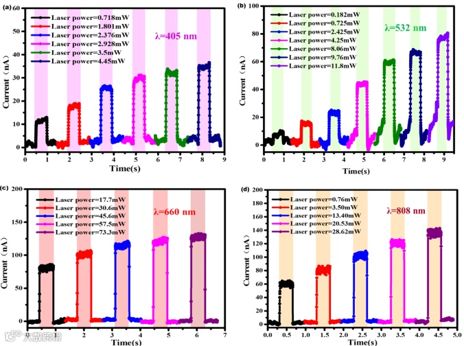 在相同环境下,持续辐照器件,分别测试电极1-3、1-2和3-4端的基于铌酸锂块材基底的石墨烯光电探测器I-V曲线,如图3(a)。通过对比可知,石墨烯在不同区域内掺杂类型不同,电极1-3处于石墨烯P型区,电极2-4处于石墨烯N型区,电极1-2处于石墨烯P-N型区。石墨烯P-N同质结能带弯曲,如图3(b)所示。在P型区域中,由于铌酸锂的热释电产生的正电荷掺杂,石墨烯的费米能级从狄拉克点移向价带。同样地,在N型区域中,石墨烯的费米能级从狄拉克点移向导带。在热平衡状态下,P型区域和N型区域的费米能级保持一致,N型区域的费米能级高,电子从N型区域流向P型区域,使得能带向上弯曲。由于P型区域处于电子填充,能带向下弯曲。图4展现器件在不同波长和光功率下光电探测响应性能。