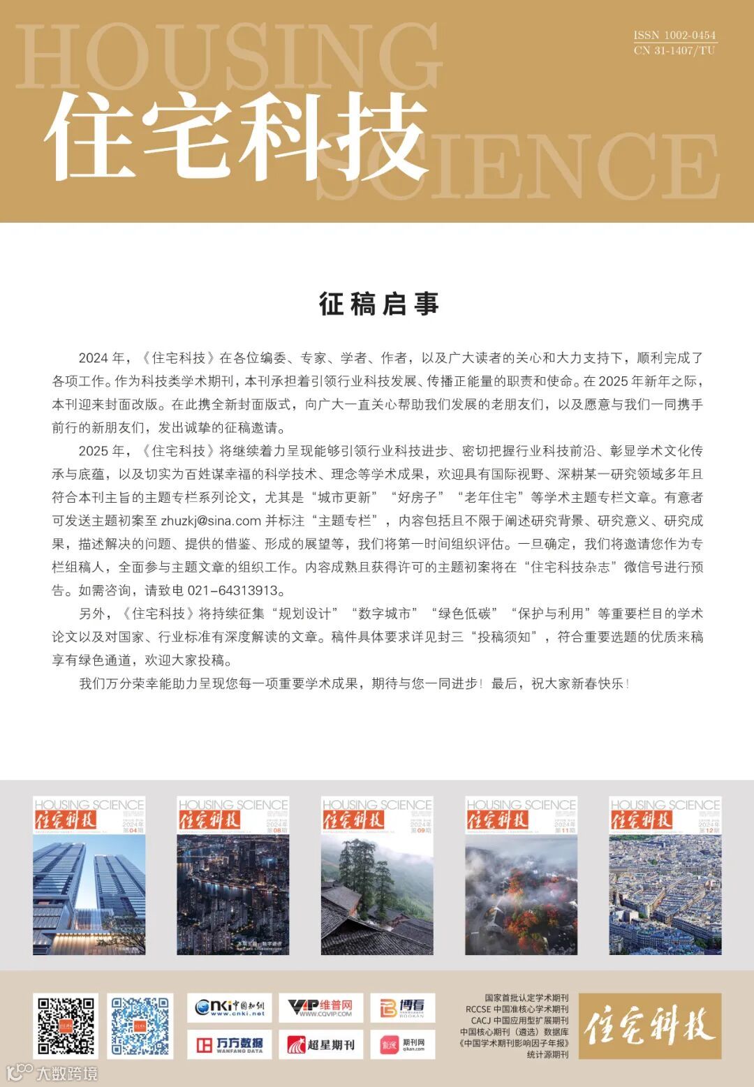 2024 年,《住宅科技》在各位编委、专家、学者、作者,以及广大读者的关心和大力支持下,顺利完成了各项工作。作为科技类学术期刊,本刊承担着引领行业科技发展、传播正能量的职责和使命。在 2025 年新年之际,本刊迎来封面改版。在此携全新封面版式,向广大一直关心帮助我们发展的老朋友们,以及愿意与我们一同携手前行的新朋友们,发出诚挚的征稿邀请。