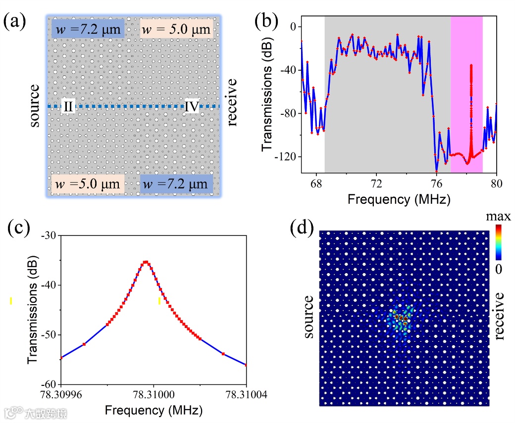 图2:基于该声子晶体拓扑边界态及角态构建的带通滤波器。a器件构型;b透射谱;c理论Q值超106;d角态的激发场。