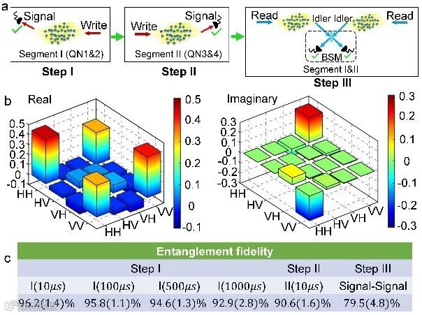 此外,结合实时反馈的高速控制系统,通过将先产生量子纠缠的中继模块存储至相邻中继模块也产生量子纠缠之时,实现了相邻两个量子中继模块内部的量子纠缠的异步制备。最后在两个模块之间通过纠缠交换,实现量子中继模块的高效纠缠连接。