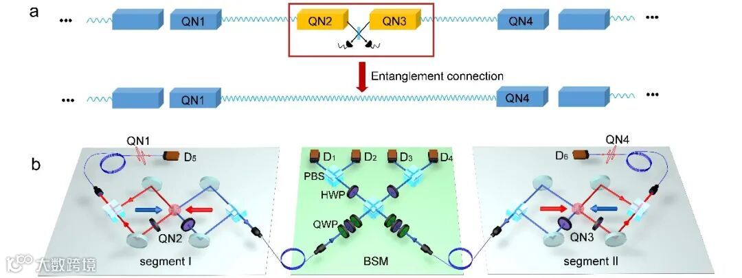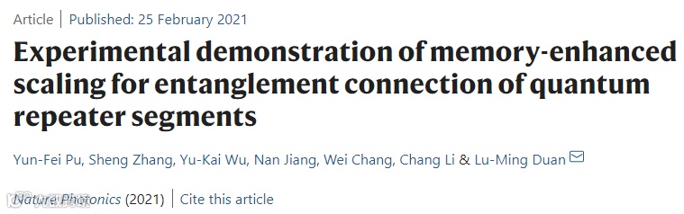该成果的研究论文《量子中继模块纠缠连接的实验实现》(Experimental demonstration of memory-enhanced scaling for entanglement connection of quantum repeater segments)于近日刊发于国际学术期刊《自然·光子学》(Nature Photonics)。
