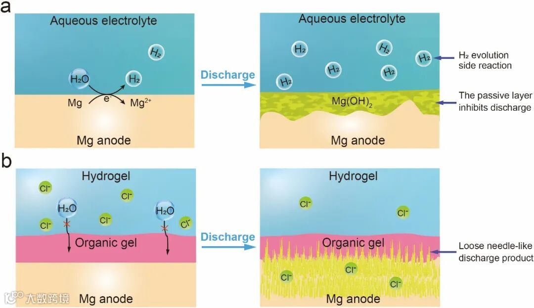 图1 镁空气电池在(a)常规液态电解质和(b)双层凝胶电解质中的放电示意图。