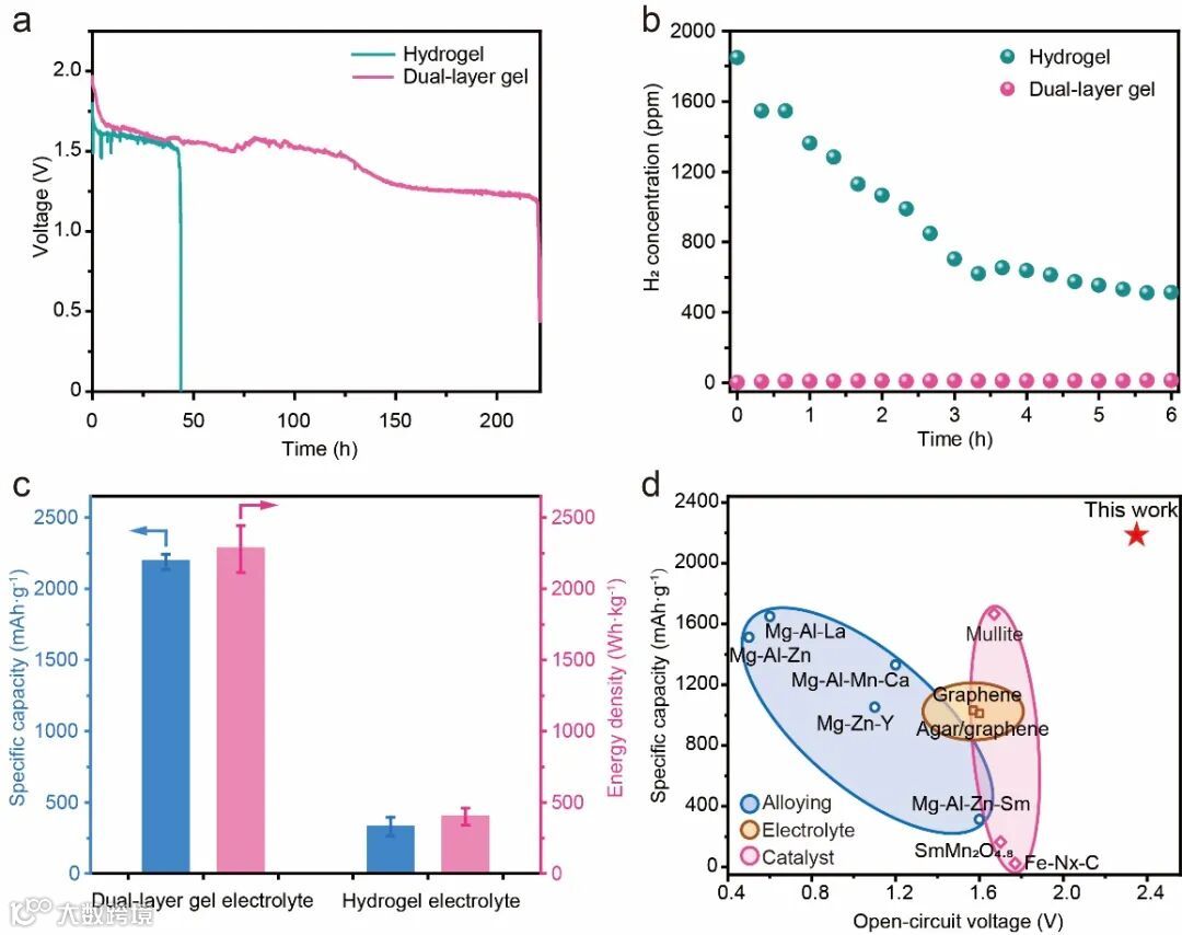 南京大学张晔课题组等设计了一种双层凝胶电解质,实现了对镁金属负极的保护以及对放电产物的调控,获得了具有高能量密度的镁空气电池(2282 W h·kg-1,基于全部空气电极和镁负极的质量),远高于目前文献中采用合金化负极和抗腐蚀电解液等策略的镁空气电池。