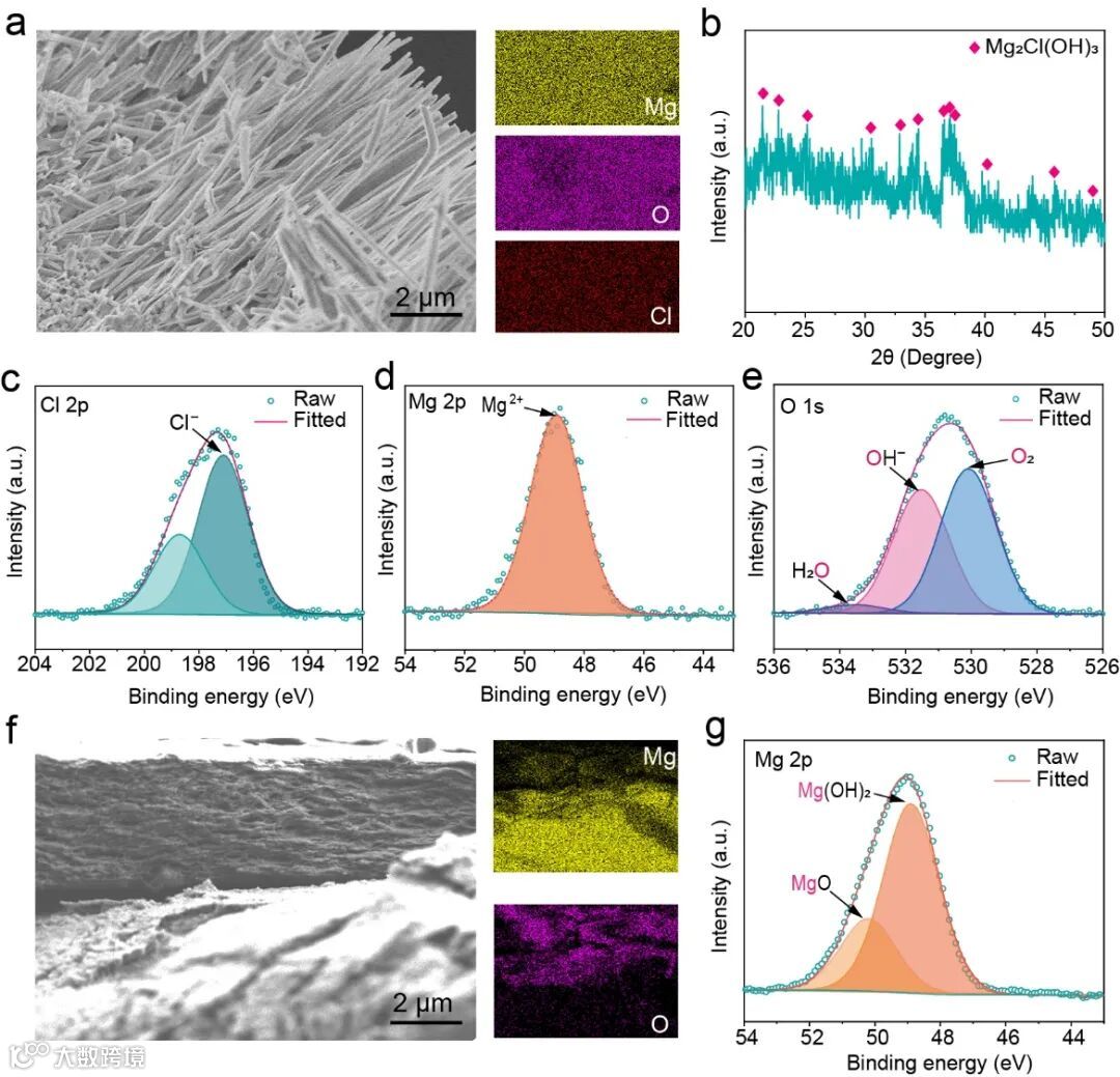 图3 放电产物分析。(a-e)使用含氯金属盐的双层凝胶电解质的镁空气电池产物为针状形貌的Mg2Cl(OH)3。(f-g)使用不含氯金属盐的双层凝胶电解质的镁空气电池产物为致密的氢氧化镁。