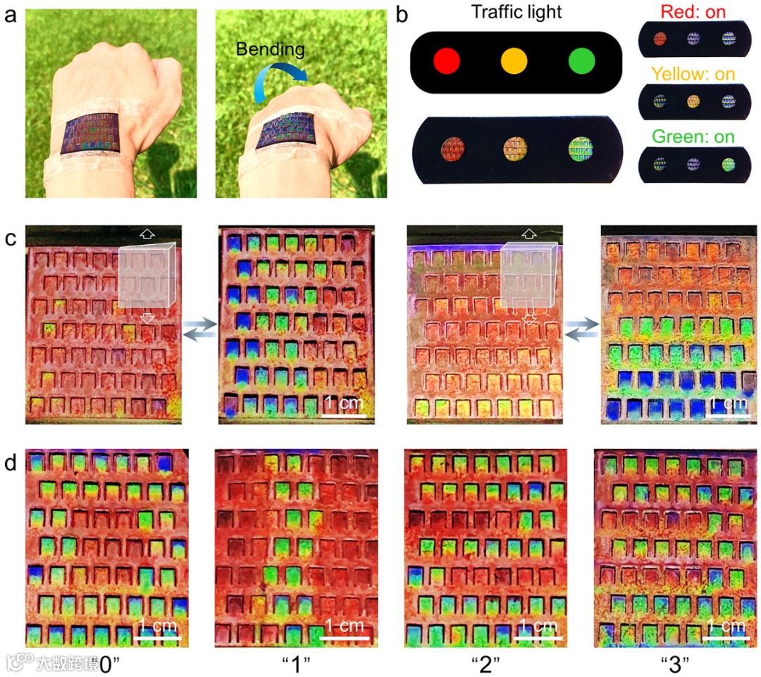 图5 PhC-PDMS kirigami的应用:利用薄膜厚度对翘起角度的控制关系,通过控制薄膜厚度分布,有效地实现了显示设计的图案化。