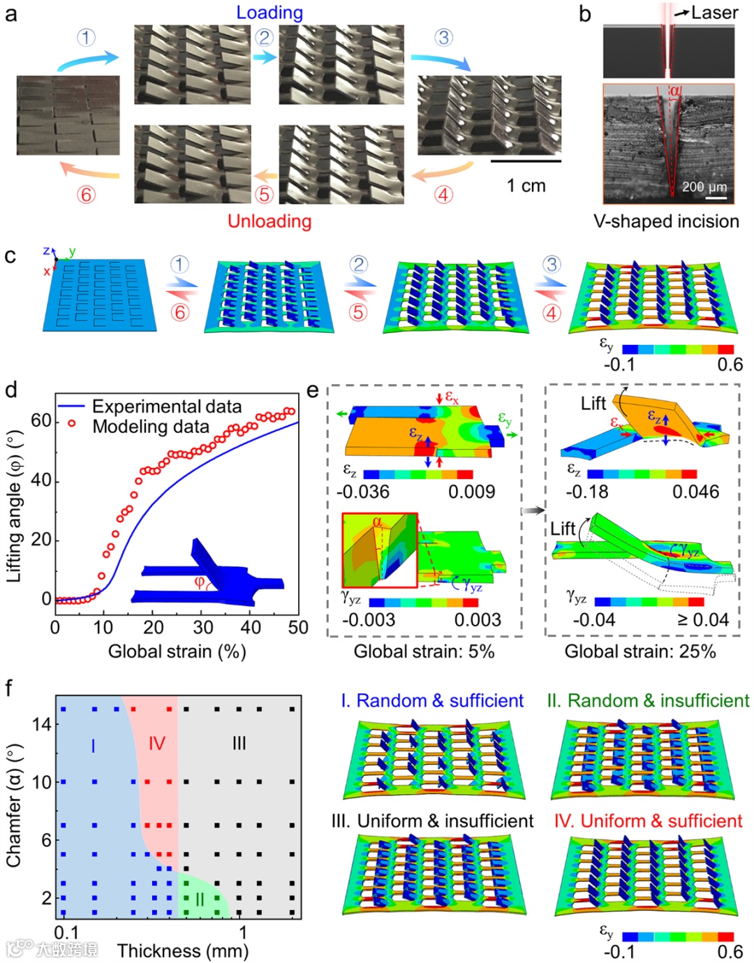 如何利用该PDMS剪纸薄膜实现均一一致、高精度准确可控的颜色变化?研究团队从理论和实验上研究了激光切割、剪纸图案设计以及薄膜基材的组成对剪纸结构由二维到三维变化的影响,揭示了PhC-PDMS kirigami发生面外高精度可控变形的机理。研究团队对激光切割的切口断面进行了表征,发现激光切割的切口断面呈V字形,平均倒角(α)约6.4°,利用有限元仿真模拟受力分析,发现在拉伸载荷的作用下,x方向发生收缩 (εx),导致矩形鳞片与铰链之间的连接区域产生了yz平面的上、下表面剪切应变(γyz)。由于V形切口存在,导致下表面的剪切应变比上表面的剪切应变影响更大,最终使得矩形鳞片向面外弹出。研究发现薄膜基材的厚度和激光切口倒角α值对剪纸结构的变化起着至关重要的作用。模拟结果表明,根据不同的厚度和α,阵列单元的面外变形方式可分为四种:I. 阵列以充分弹出、但面外变形方向是随机的;II. 阵列不能充分弹出,且面外变形的方向是随机的;III. 阵列不能充分弹出,但面外变形的方向是统一的;IV. 阵列可以充分弹出,并且面外变形的方向也是统一的。模拟结果表明当薄膜厚度在0.3mm至0.5mm之间,α在5°至15°之间时,可以实现均一一致的面外弹出形变(区域 IV)。该研究团队所设计的剪纸结构表现出对实际制备误差的高度容忍性,易于实现。