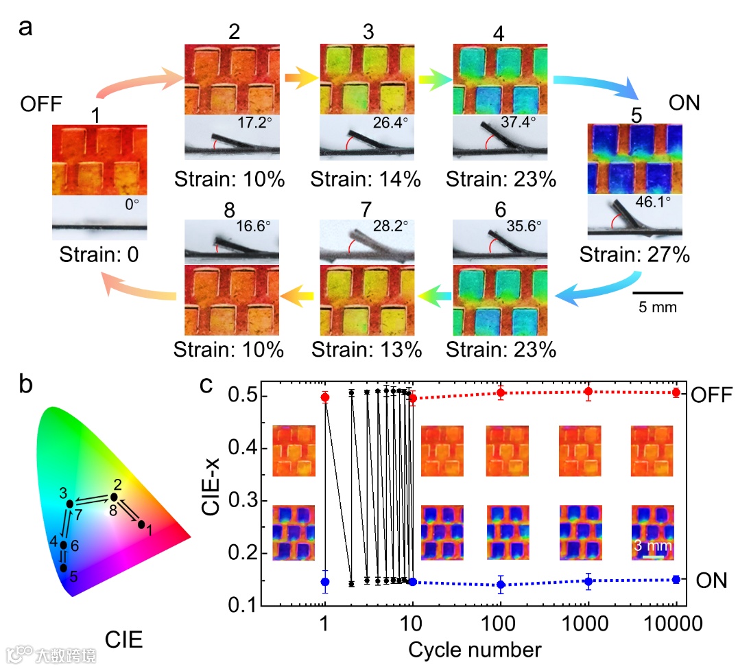 当拉伸PhC-PDMS kirigami时,可以实现薄膜色彩的全色系变化。这是由于PhC矩形鳞片的颜色主要受弹出角度φ控制,而φ与单轴拉伸载荷是一一对应的关系,因此可以实现色彩的精确调控。此外,该色彩变化在10000次的循环控制下,仍然保持稳定。
