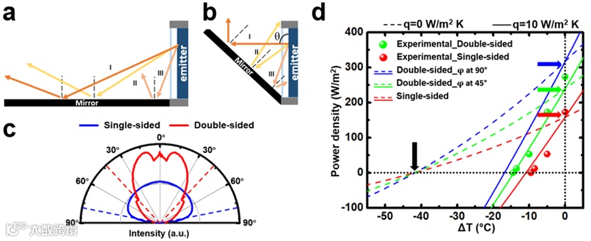 如图3所示,该团队以选择吸收薄膜作为反射镜,搭建了双面辐射制冷系统,并在室内的模拟环境下对比测试了该系统的制冷效果:相较于传统的单面辐射制冷系统,双面系统可以极大程度地提升制冷效果。在以液氮为冷源的室内模拟环境中,双面系统可实现14°C的降温。利用PID温度控制系统,该团队对双面系统进行了功率测试,得出其垂直辐射膜在室温条件下可提供270W/m2的制冷功率,在传统单面系统的基础上近乎提升了一倍。