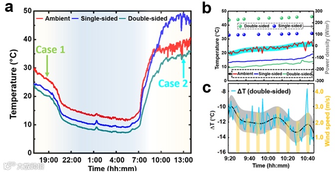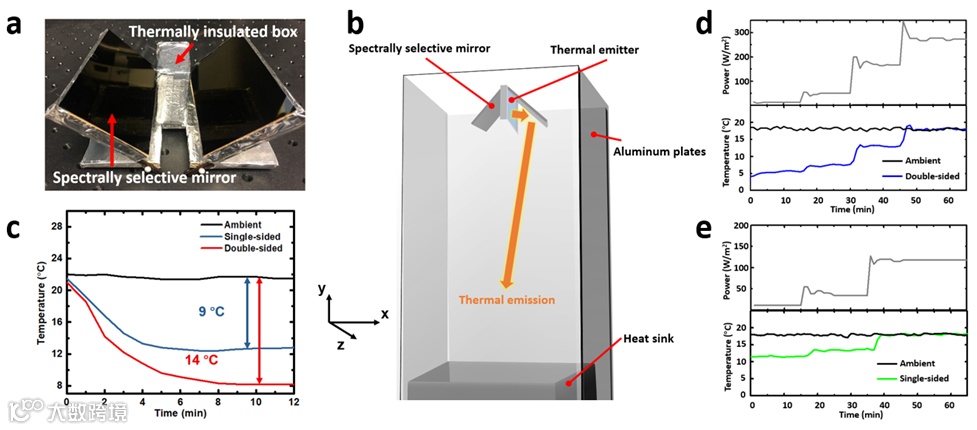 图3.双面辐射制冷系统以及其制冷效果测试结果。