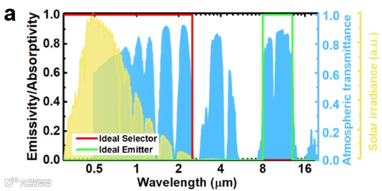 自然界的任何物体都会产生热辐射。热量通过电磁波的方式在空间中传播。当环境温度处于30摄氏度左右时,热辐射的主要能量恰好集中在波长为10微米的区域附近。另一方面,地球的大气层也具有着独特的特性:由于空气中不同分子的吸收,大气层在多个波段呈现高透射特性。如图1所示,在8至13微米的波段,大气层的透射率高达80%,与地表热辐射的主要分布区域重叠。因此,在理想环境中,地表物体的热辐射可以源源不断的通过大气层的透明窗口被极低温的外太空所吸收。热辐射体则因为损失了能量,其温度持续下降,直到达到新的热稳态。