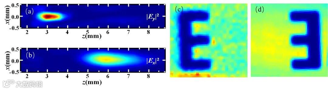 图1.偏振可控的超表面透镜:(a,b)双焦点聚焦和偏振旋转功能;(c,d)太赫兹偏振依赖的高分辨扫描成像。