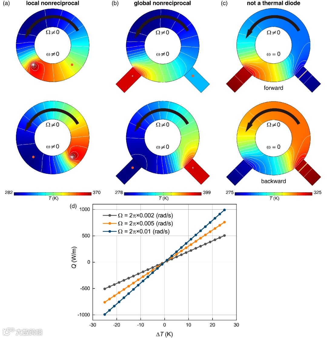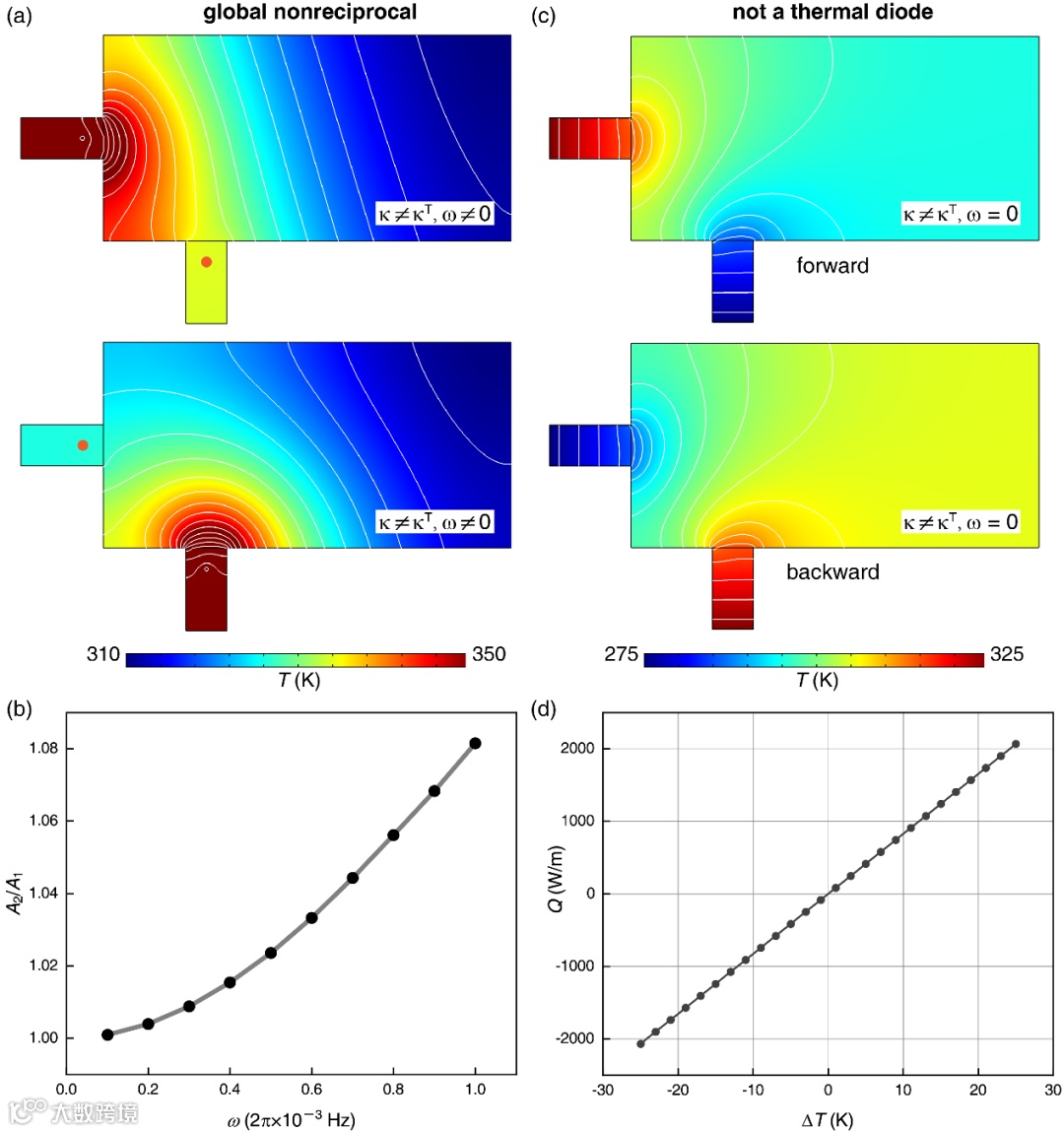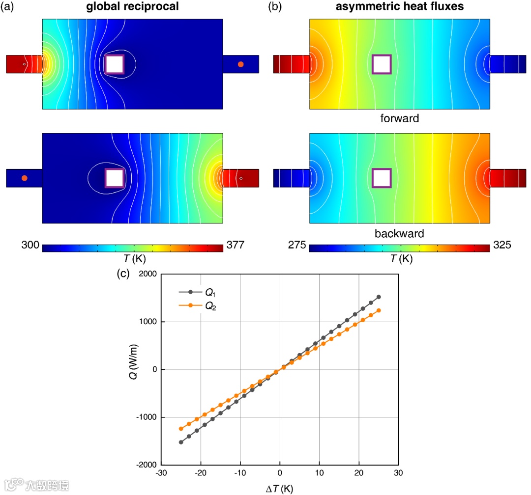 该工作完善了扩散互易性的相关概念和理论框架,区分了材料层面和系统层面上两种不同的互易性,并严格论证了稳态全局非互易与热二极管效应的等价性(当内部产热与环境温度无关时)。相关结果为传热研究和传热器件设计提供了理论依据和新的发展方向。