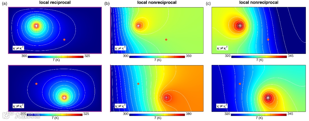 基于上述三种不同概念之间的联系与区别,我们进一步讨论了几种代表性的实现热二极管的机制。研究发现,几何上非对称的非线性性一般都能实现热二极管效应(图4)。非对称的热导率张量对局域互易性的影响取决于系统的边界条件,当系统中存在Neumann或混合边界条件时,可以打破局域互易性(图5)。但在稳态下,系统的全局互易性不能通过引入非对称热导率张量来打破,因此该机制也不能用于实现热二极管(图6)。由于对流场与非对称热导率张量的类似效应,没有温度依赖性的强迫对流也无法打破稳态下的全局互易性,因而不能用于实现热二极管(图7)。最后,当系统内部存在其他热源,且其产热量与环境温度相关时,系统尽管可以保有全局互易性,却依然有热二极管效应(图8)。