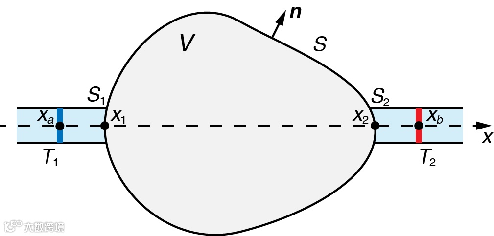 图2中,系统依然为V,但其左右分别与两个传热通道相连接。为简化讨论,假设两通道都处在x轴上,有相同的几何尺寸,并由相同的各向同性均匀材料构成。基于上述考虑,这里规定格林函数对应的点热源只能放置在某个通道中,例如图2的xa或xb处。为了使结果不依赖于通道的具体参数,可以使xa或xb趋近于系统与通道的界面x1或x2处。显然,这样的格林函数与系统的传输性质有直接的联系,但这里还需定义系统的散射系数。在稳态下,通道内的温度场不具有图3中红蓝色箭头所示的方向性,因此需要先研究时谐情况,此时格林函数G(r|xa,w)对应的是在xa处以频率w振荡的单位点热源。基于波动系统中的常用做法,我们可以简单计算在通道内格林函数的波数k(为一复数),并规定波数实部为负(正)的部分为向x正(负)方向传播的场。这样就可以用对应场的幅值来计算系统的散射系数,例如从左(右)端口到右(左)端口的透射系数为B2/A1(B1/A2)。若两个透射系数相等,则该传热系统具有全局互易性。可以证明,全局互易性等价于G(xb|xa,w) = G(xa|xb,w)。基于这一结论,可以通过令w → 0来获得系统在稳态下全局互易性的定义,从而解决了稳态下散射系数缺乏良好定义的困难。
