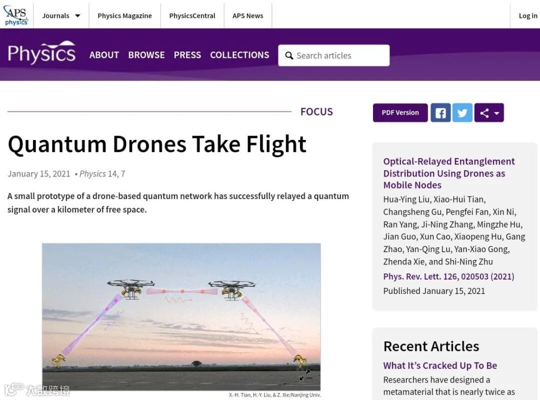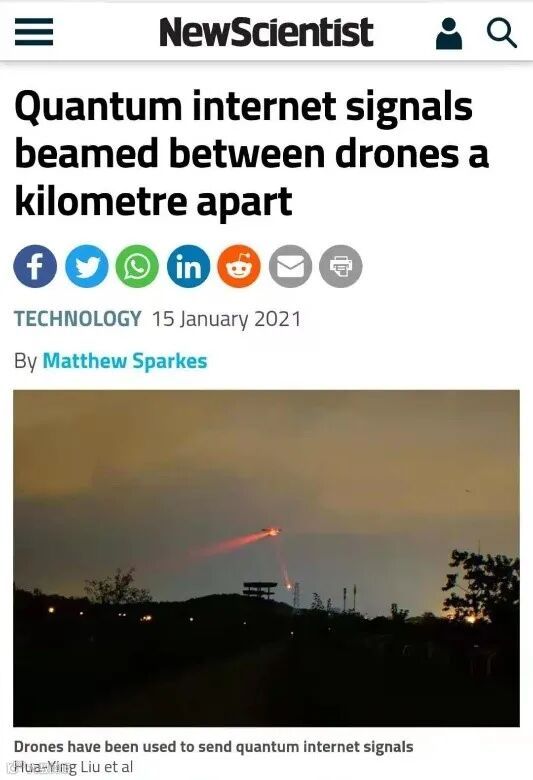 美国《物理》(Physics)评论文章的题目是:“量子无人机组正在起飞(Quantum Drones Take Flight)”。评论指出:“世界上已有一些团队正在研究无人机通信系统,而这个团队去年就实现了单一无人机与两个地面站之间的量子连接。但为了实现纠缠光子更远距离的传输,必须克服光本身的固有属性—光的衍射带来的损失,这就要构建光的准直系统。”文中介绍,“该研究团队通过采用光学中继的方法解决衍射损耗这一自由空间光量子传输的核心问题,采用了增加第二架无人机,作为第一架无人机和地面站之间的中继,通过中继过程重塑了光子的波前,从而使光子能以更高效率进入地面站上的望远镜。”文章还认为 “卫星价格昂贵而且难以适应地面上不断变化的需求”,而“携带光学设备的小型无人机可以提供一种灵活的解决方案,在量子网络中链接多个用户”,“该工作可以催生基于无人机的量子网络,在城市和农村地区上空实现可重构定位部署。”