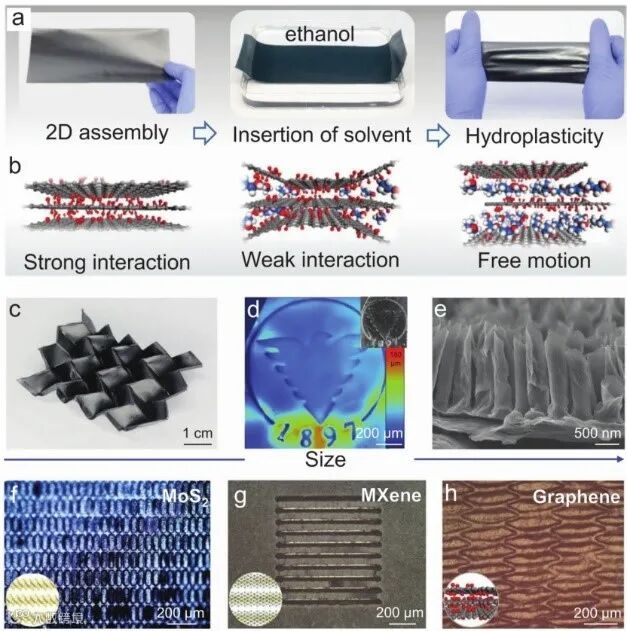 2D(二维)薄片是一大类原子级薄材料,例如石墨烯、氧化石墨烯和二硫化钼。2D薄片非凡的物理和化学性能有望转化为其宏观组件的卓越性能。然而,完整2D薄片的固有层间相互作用导致固体加工性差。一种替代性的方法是在表面活性剂或表面改性的辅助下,由2D薄片的均匀分散体进行溶液加工,即溶液加工方法,包括浇铸、纺丝和添加剂制造,已用于将稀释的分散体加工成宏观形式,如薄膜、纤维和气凝胶。但由于体积收缩率极大,对特征尺寸精度的控制有限。因此,固态塑料加工是获得高精度的一种优选方法。然而,塑料加工本质上会受到2D片状固体的强层间相互作用的阻碍。因此,迫切需要一种能够使精细结构易于由2D材料构建的加工策略。