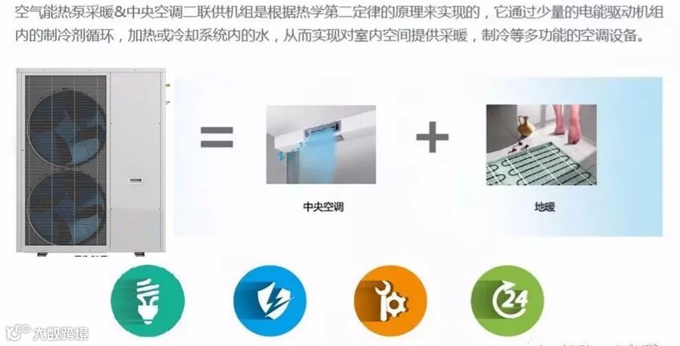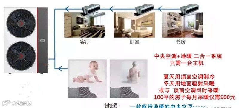 “中央空调+地暖”两联供,是继第一代窗机空调、第二代壁挂机(柜机、风管机)空调、第三代氟机中央空调后的第四代中央空调。