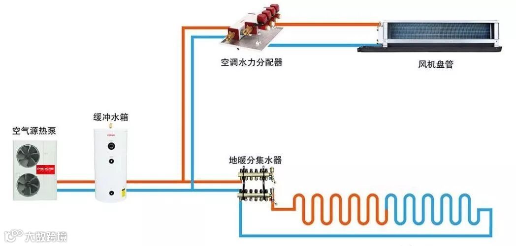冬季供热水,从室外机直接提供45℃左右热水供地板采暖。