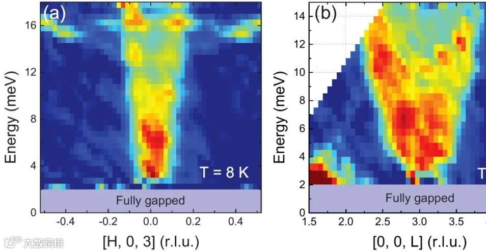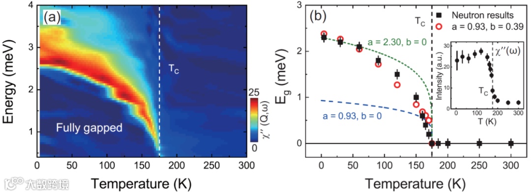 图2 Co3Sn2S2的自旋波能隙及其随温度的演化,其中虚线为参照铁磁序参量拟合结果(b=0),红色空心点为考虑反常霍尔电导贡献之后的数据拟合结果(b≠0)。