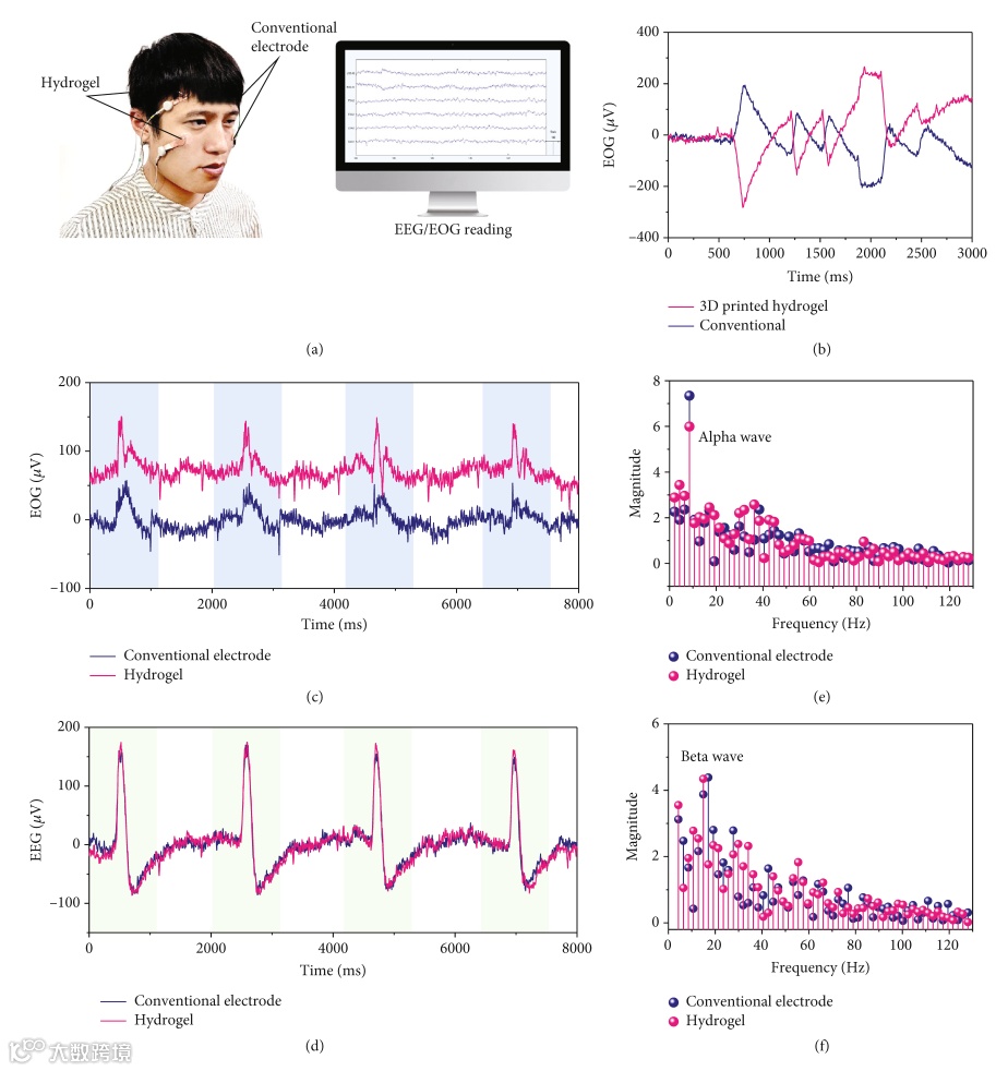 人的大脑是由数以万计的神经元组成的,这些神经元之间相互传递信息,生理活动会产生脑电信号,但脑电信号强度较低。而本研究打印的水凝胶具有低于100μV的工作电压,被作为柔性电极检测和采集脑电信号(EEG)(图4)。本文提出的可3D打印水凝胶电极能够采集人体睁闭眼时候的脑/眼电信号,同时当志愿者在闭上眼睛并放松时,脑电信号显示出明显的α波(8~13Hz),当志愿者睁开眼睛并积极思考时,脑电α波即刻消失并逐渐向β波(14~30Hz)方向移动。与当前最精确的传统脑电信号采集装置对比实验表明,新体系水凝胶可以准确采集大脑中的脑电信号,反映大脑活动的整体信息,显示出在人机交互特别是低温领域的脑机接口等方面的应用潜力。