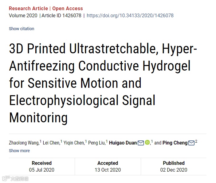 近期,湖南大学王兆龙助理教授、段辉高教授与上海交通大学郑平院士等人合作,基于微立体光刻3D打印技术构建了一种能够耐受-115℃极高导电能力的水凝胶体系,实现了极低温条件下的可穿戴设备运动信号检测及脑电信号高精度采集。文章以“3D Printed Ultrastretchable, Hyper-Antifreezing Conductive Hydrogel for Sensitive Motion and Electrophysiological Signal Monitoring”为题发表在Research(Volume 2020 |Article ID 1426078)上。