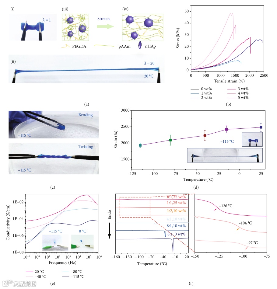 纳米羟基磷灰石的加入可以与水凝胶高分子链之间形成强烈的物理作用(图2a),从而大幅提高3D打印水凝胶的拉伸性(2500%),并进一步提高其机械强度(图2b),水凝胶中纳米羟基磷灰石的最佳含量为2%左右;高浓度离子盐和三元醇的协同作用赋予了3D打印水凝胶极端温度耐受性(-115℃左右),3D打印水凝胶在极低温情况下仍然能够完成拉伸、弯曲和扭转的动作,并具有良好的低温导电性(图2c-e)。图2f中DSC曲线表明水凝胶在-120℃附近出现玻璃化转变,证明水凝胶良好的抗冻性能(图2f)。