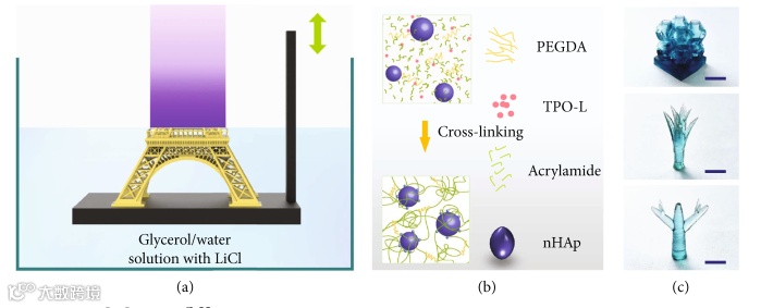 研究人员基于面投影微立体光刻(PμSL)3D打印技术,设计和制造了一种具有超拉伸性、导电性、极端温度耐受性的水凝胶,并应用于柔性传感器和脑电信号采集的柔性电极脑机接口。通过引入纳米颗粒分散在水凝胶中,极大提高了3D打印水凝胶的拉伸性能;引入亲水性的三元醇作为光引发剂TPO-L的良性溶剂,将不溶于水的TPO-L均匀分散在水中,大大提高水凝胶的光固化速度。同时,三元醇和高浓度离子盐的协同作用赋予了水凝胶极佳的导电性和抗冻性。