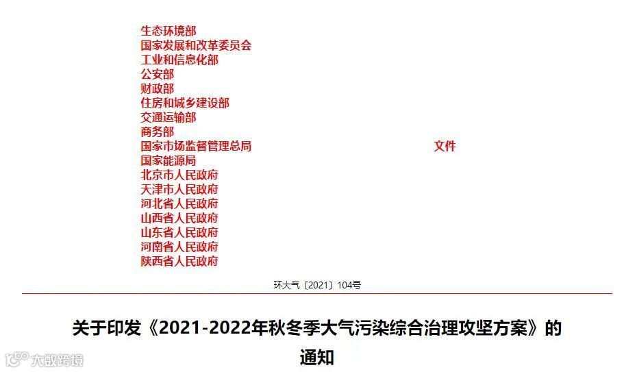 近日,国家发改委、国家能源局、生态环境部、工信部、公安部、财政部、住建部、交通运输部、商务部、国家市场监督管理总局、北京市人民政府、天津市人民政府、河北省人民政府、山西省人民政府、山东省人民政府、河南省人民政府、陕西省人民政府17部门10月29日联合发布《2021-2022年秋冬季大气污染综合治理攻坚方案》。