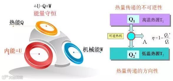 热泵是一种能从自然界的空气、水或土壤中获取低位热能,经过电能做功,提供可被人们所用的高位热能的装置。学习热泵原理,不得不说的是热力学第一定律以及热力学第二定律,请看下面两张图: