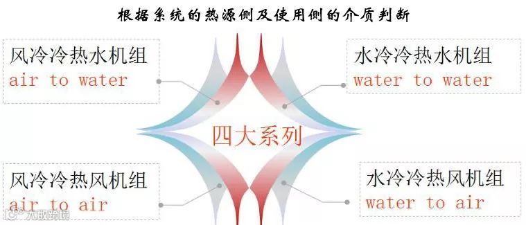 根据系统的热源侧及使用侧的介质判断,热泵主要可以分为四大类:风冷冷热水机组、水冷冷热水机组、风冷冷热风机组、水冷冷热风机组。